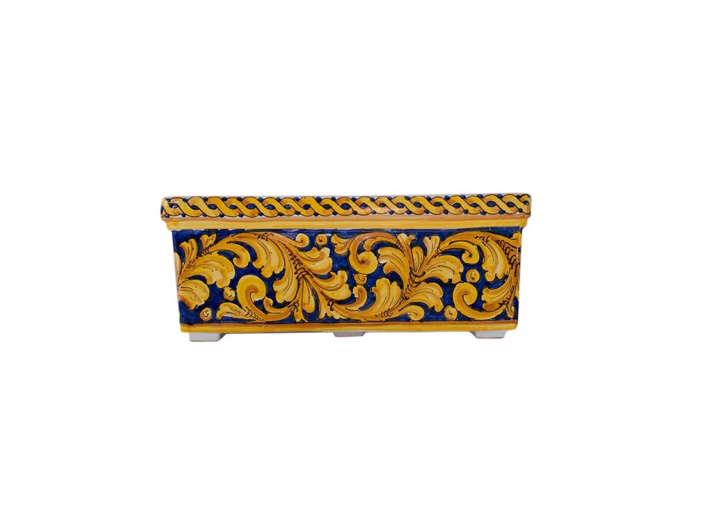 Výrazně zdobený horní lem truhlíku společně s tónovanými žlutými květy a tmavě modrým podkladem je skvělá volba dekorace do bytu nebo na zahradu.
